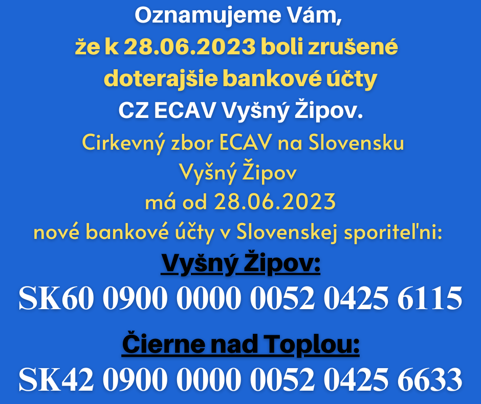Zmena bankových účtov CZ ECAV Vyšný Žipov